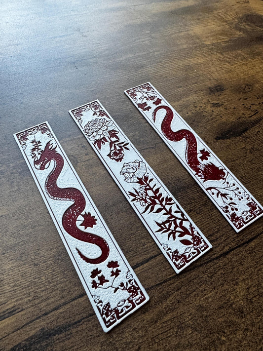 Blossom Guardians Bookmark Set – Red and White Dragon and Flower Bookmarks | Fantasy & Floral Page Markers (Set of 3 or Individual)